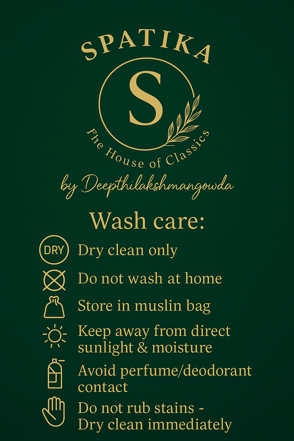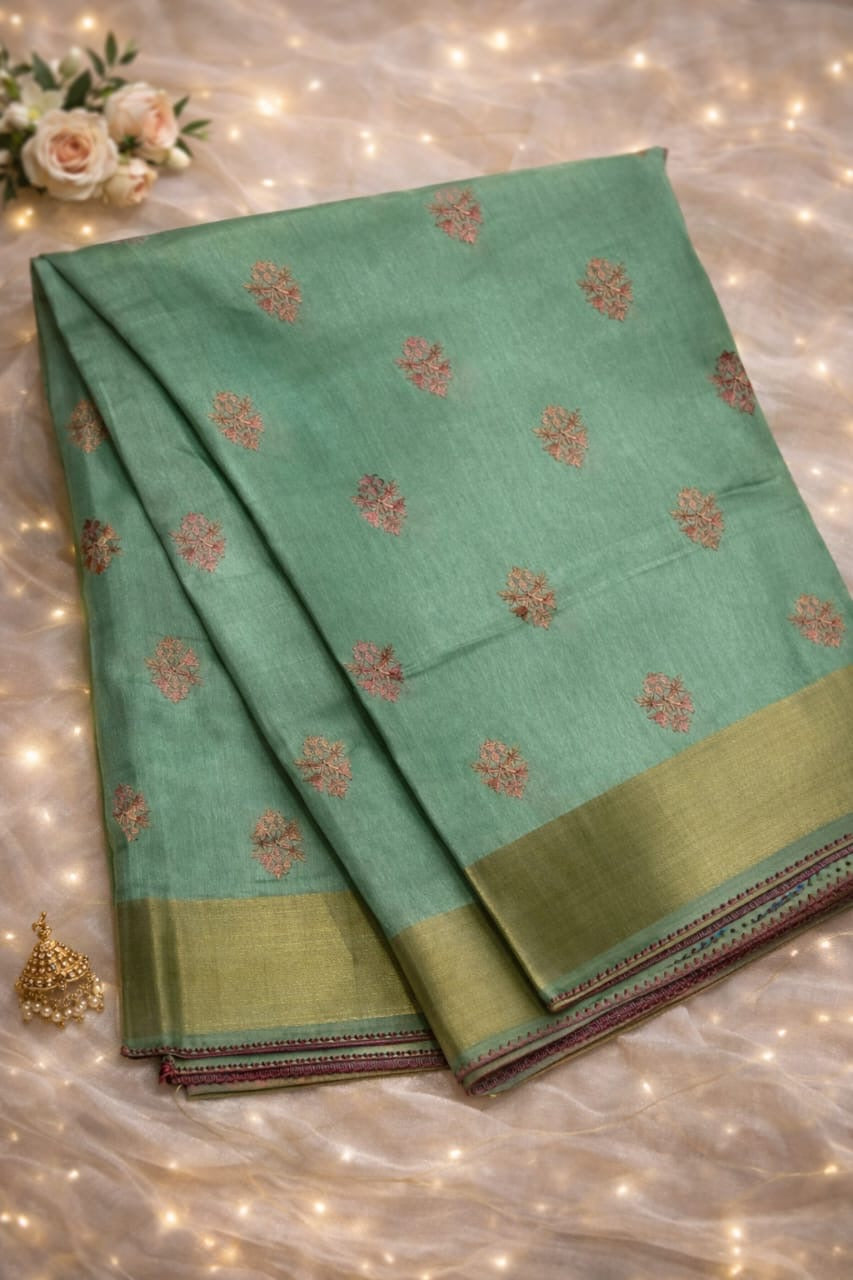 "Experience elegance and tradition with our Tussar satin saree. Adorned with beautiful embroidery buttas made with high-quality zari, this saree is perfect for any festive occasion. Its soft texture and intricate design truly make it a timeless piece to add to your wardrobe. Make a statement with Tussar."